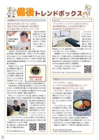 37%u30c8%u30d4%u30c3%u30af%u3000%u300c%u30d5%u30a7%u30a4%u30b9%u30c8%u30ec%u30fc%u30cb%u30f3%u30b0%u30b8%u30e0 HEAD SPA%u300d%uff08%u798f%u5c71%u5e02%u6771%u624b%u57ce%u753a3-35-15 2%u968e%uff09%u306f%u3001%u8868%u60c5%u7b4b%u3092%u6574%u3048%u308b%u6a5f%u5668%u3092%u5c0e%u5165%u3057%u3066%u3044%u308b%u3002%u72ec%u81ea%u306e%u9854%u30c8%u30ec%u30fc%u30cb%u30f3%u30b0%u3068%u982d%u76ae%u3078%u306e%u30a2%u30d7%u30ed%u30fc%u30c1%u3067%u3001%u7f8e%u3057%u3044%u30d5%u30a7%u30fc%u30b9%u30e9%u30a4%u30f3%u3092%u76ee%u6307%u3059%u3002%u3000%u300c%u982d%u9854%u7b4b%u30ea%u30d5%u30c8%u30b1%u30a2%u300d%uff0845%u5206%uff09%u306f%u9854%u306e%u7b4b%u30c8%u30ec%u3068%u982d%u76ae%u306e%u307b%u3050%u3057%u3092%u540c%u6642%u306b%u884c%u3044%u3001%u300c%u5185%u5074%u304b%u3089%u6301%u3061%u4e0a%u304c%u308b%u611f%u899a%u3092%u4f53%u611f%u3067%u304d%u308b%u300d%u3068%u8a71%u984c%u306e%u30b1%u30a2%u3002%u5e74%u9f62%u3092%u91cd%u306d%u308b%u3053%u3068%u3067%u5909%u308f%u308b%u9854%u306e%u8f2a%u90ed%u3092%u6574%u3048%u308b%u3002%u901a%u5e386600%u5186%u3060%u304c%u30019%u670830%u65e5%u307e%u3067%u306f%u4e88%u7d04%u6642%u306b%u300c%u3053%u306e%u8a18%u4e8b%u3092%u898b%u305f%u300d%u3068%u4f1d%u3048%u308b%u30685500%u5186%u306b%u5272%u308a%u5f15%u304f%u3002%u521d%u56de%u9650%u5b9a%u3002%u3000%u300c%u305f%u308b%u307f%u306f%u5f85%u3063%u3066%u304f%u308c%u307e%u305b%u3093%u3002%u4eca%u3059%u3050%u59cb%u3081%u3066%u307b%u3057%u3044%u300d%u3068%u540c%u5e97%u3002%u4e88%u7d04%u306fQR%u30b3%u30fc%u30c9%u304b%u3089%u3002%u554f%u3044%u5408%u308f%u305b%u5148%u25bdhttps://coubic.com/face-lift-jim%u300c%u30d5%u30a7%u30a4%u30b9%u30c8%u30ec%u30fc%u30cb%u30f3%u30b0%u30b8%u30e0 HEAD SPA%u300d%u9854%u306e%u8f2a%u90ed%u3092%u6574%u3048%u3001%u305f%u308b%u307f%u6539%u5584%u76ee%u6307%u305d%u30469%u670830%u65e5%u307e%u3067%u304a%u5f97%u306a%u79cb%u306e%u30ad%u30e3%u30f3%u30da%u30fc%u30f3%u30c8%u30d4%u30c3%u30af%u3000%u798f%u5c71%u5e02%u306736%u5e74%u306e%u5b9f%u7e3e%u3092%u6301%u3064%u300c%u4e03%u7530%uff08%u3057%u3061%u3060%uff09%u5f0f %u798f%u5c71%u6559%u5ba4%u300d%uff08%u540c%u5e02%u4e09%u4e4b%u4e38%u753a4-28%uff09%u306f%u300111%u6708%u672b%u307e%u3067%u79cb%u306e%u5165%u5ba4%u30ad%u30e3%u30f3%u30da%u30fc%u30f3%u3092%u5b9f%u65bd%u3057%u3066%u3044%u308b%u3002%u3000%u4e03%u7530%u5f0f%u306f%u3001%u5b50%u4f9b%u304c%u751f%u307e%u308c%u6301%u3063%u305f%u80fd%u529b%u3092%u6700%u5927%u9650%u306b%u5f15%u304d%u51fa%u3059%u5e7c%u5150%u6559%u5ba4%u3002%u5bfe%u8c61%u5e74%u9f62%u306f0%u6b73%u30fc%u5c0f%u5b66%u751f%u3067%u3001%u305d%u308c%u305e%u308c%u306e%u767a%u9054%u306b%u5408%u308f%u305b%u305f%u697d%u3057%u304f%u3066%u30d0%u30e9%u30f3%u30b9%u306e%u53d6%u308c%u305f%u6559%u80b2%u30d7%u30ed%u30b0%u30e9%u30e0%u304c%u4eba%u6c17%u3060%u3002%u6628%u5e74%u306f%u30ea%u30b5%u30fc%u30c1%u4e8b%u696d%u306a%u3069%u306e%uff08%u682a%uff09%u30a4%u30fc%u30c9%uff08%u6771%u4eac%uff09%u304c%u5b9f%u65bd%u3059%u308b%u5e7c%u5150%u6559%u5ba4%u306e%u9867%u5ba2%u6e80%u8db3%u5ea6%u8abf%u67fb%u3067%u3001%u300c%u30a4%u30fc%u30c9%u30fb%u30a2%u30ef%u30fc%u30c92024 %u512a%u79c0%u8cde%u300d%u3092%u53d7%u8cde%u3057%u305f%u3002%u3000%u77e5%u8b58%u3060%u3051%u3067%u306a%u304f%u3001%u4e3b%u4f53%u6027%u3084%u5354%u8abf%u6027%u306a%u3069%u8c4a%u304b%u306a%u5fc3%u3001%u4ed6%u8005%u3068%u306e%u30b3%u30df%u30e5%u30cb%u30b1%u30fc%u30b7%u30e7%u30f3%u3092%u56f3%u308b%u969b%u306b%u5fc5%u8981%u306a%u601d%u8003%u529b%u3084%u5224%u65ad%u529b%u3001%u8868%u73fe%u529b%u3082%u4f38%u3070%u3059%u3002%u30ec%u30c3%u30b9%u30f3%u306b%u306f%u3055%u307e%u3056%u307e%u306a%u56f3%u67c4%u306e%u300c%u30d5%u30e9%u30c3%u30b7%u30e5%u30ab%u30fc%u30c9%u300d%u3084%u300c%u6b4c%u30ab%u30fc%u30c9%u300d%u3001%u7d75%u672c%u306a%u30691000%u70b9%u4ee5%u4e0a%u306e%u6559%u6750%u3092%u4f7f%u7528%u3059%u308b%u3002%u3000%u4e73%u5e7c%u5150%u671f%u306e1%u30ab%u6708%u9593%u306e%u8133%u306e%u767a%u9054%u30b9%u30d4%u30fc%u30c9%u306f%u5927%u4eba%u306e10%u5e74%u5206%u3068%u3055%u308c%u3001%u3053%u306e%u6642%u671f%u306e%u53d6%u308a%u7d44%u307f%u306b%u3088%u308a%u8133%u306e%u6210%u9577%u304c%u5927%u304d%u304f%u5de6%u53f3%u3055%u308c%u308b%u3068%u3044%u308f%u308c%u3066%u3044%u308b%u3002%u540c%u6559%u5ba4%u3067%u306f%u6708%u9f62%u5225%u306e%u30d7%u30ed%u30b0%u30e9%u30e0%u3068%u6700%u59276%u4eba%u307e%u3067%u306e%u5c11%u4eba%u6570%u5236%u3067%u3001%u7740%u5b9f%u306b%u8133%u3092%u80b2%u3066%u308b%u3002%u3000%u540c%u30ad%u30e3%u30f3%u30da%u30fc%u30f3%u306f9%u30fb10%u30fb11%u6708%u306b%u901a%u3044%u59cb%u3081%u308b%u4eba%u304c%u5bfe%u8c61%u3002%u5165%u5ba4%u91d1%u304c%u7121%u6599%u306b%u306a%u308b%u307b%u304b%u3001%u5bfe%u8c61%u306e%u6559%u6750%u306e%u4e2d%u304b%u3089%u5e0c%u671b%u306e%u54c1%u3092%u5168%u54e1%u306b%u9032%u5448%u3059%u308b%u7279%u5178%u3082%u3042%u308b%u3002%u5165%u5ba4%u524d%u306b%u306f%u7121%u6599%u304a%u8a66%u3057%u30ec%u30c3%u30b9%u30f3%u3092%u53d7%u3051%u308b%u3053%u3068%u304c%u3067%u304d%u3001%u4f53%u9a13%u8005%u306b%u306f1000%u5186%u5206%u306e%u91d1%u5238%u3092%u9032%u5448%u3059%u308b%u3002%u30af%u30aa%u30ab%u30fc%u30c9%u3001%u300c%u30b9%u30bf%u30fc%u30d0%u30c3%u30af%u30b9%u30b3%u30fc%u30d2%u30fc%u300d%u306e%u30d7%u30ea%u30da%u30a4%u30c9%u30ab%u30fc%u30c9%u3001%u300c%u30b5%u30fc%u30c6%u30a3%u30ef%u30f3%u30a2%u30a4%u30b9%u30af%u30ea%u30fc%u30e0%u300d%u306e%u30ae%u30d5%u30c8%u5238%u306e%u3044%u305a%u308c%u304b%u3092%u9078%u3079%u308b%u3002%u3000%u300c%u5fc3%u3068%u80fd%u529b%u3092%u80b2%u307f%u3001%u8c4a%u304b%u306a%u4eba%u751f%u3092%u9001%u308c%u308b%u3088%u3046%u5b50%u4f9b%u305f%u3061%u306e%u5922%u306e%u5b9f%u73fe%u3092%u30b5%u30dd%u30fc%u30c8%u3057%u307e%u3059%u300d%u3068%u540c%u6559%u5ba4%u30029%u664230%u5206%u30fc18%u664230%u5206%u306e%u55b6%u696d%u3067%u3001%u65e5%u30fb%u6708%u66dc%u3068%u795d%u65e5%u306f%u4f11%u307f%u3002%u904a%u3073%u306a%u304c%u3089%u697d%u3057%u304f%u5b66%u3079%u308b%u300c%u4e03%u7530%u5f0f%u300d%u798f%u5c71%u306736%u5e74%u306e%u5b9f%u7e3e%u3092%u6301%u3064%u5e7c%u5150%u6559%u5ba411%u6708%u672b%u307e%u3067%u79cb%u306e%u5165%u5ba4%u30ad%u30e3%u30f3%u30da%u30fc%u30f3%u4e2d%u554f%u3044%u5408%u308f%u30