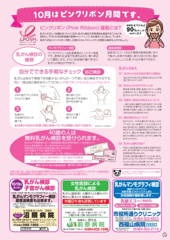 %u30d4%u30f3%u30af%u30ea%u30dc%u30f3%uff08Pink Ribbon%uff09%u904b%u52d5%u3068%u306f%uff1f%u4e73%u304c%u3093%u306e%u6b63%u3057%u3044%u77e5%u8b58%u3092%u591a%u304f%u306e%u4eba%u306b%u5e83%u3081%u3001%u4e73%u304c%u3093%u691c%u8a3a%u306e%u65e9%u671f%u53d7%u8a3a%u3092%u63a8%u9032%u3059%u308b%u3053%u3068%u306a%u3069%u3092%u76ee%u7684%u3068%u3057%u3066%u884c%u308f%u308c%u308b%u4e16%u754c%u898f%u6a21%u306e%u5553%u767a%u30ad%u30e3%u30f3%u30da%u30fc%u30f3%u3067%u3001%u5e74%u3092%u5897%u3059%u3054%u3068%u306b%u62e1%u5927%u3057%u3066%u3044%u307e%u3059%u3002%u6bce%u5e7410%u6708%u306f%u300c%u30d4%u30f3%u30af%u30ea%u30dc%u30f3%u6708%u9593%u300d%u3002%u65e5%u9803%u304b%u3089%u30bb%u30eb%u30d5%u30c1%u30a7%u30c3%u30af%u3084%u3001%u5b9a%u671f%u7684%u306a%u691c%u8a3a%u3092%u5fc3%u304c%u3051%u307e%u3057%u3087%u3046%u3002%u8a8d%u5b9aNPO%u6cd5%u4ebaJ.POSH%u3088%u308a%u63d0%u4f9b%u4e73%u304c%u3093%u306e%u65e9%u671f%u767a%u898b%u3068%u6b63%u3057%u3044%u5065%u5eb7%u610f%u8b58%u306e%u666e%u53ca%u5553%u767a%u3092%u56f3%u308b%u3053%u3068%u3092%u76ee%u7684%u3068%u3057%u3066%u3001%u4e73%u304c%u3093%u691c%u8a3a%u7121%u6599%u30af%u30fc%u30dd%u30f3%u5238%u304c%u4ea4%u4ed8%u3055%u308c%u3066%u3044%u307e%u3059%u3002 %u5bfe%u8c61%u8005%u306f%u4eca%u5e744%u670820%u65e5%u73fe%u5728%u798f%u5c71%u5e02%u306b%u4f4f%u6240%u304c%u3042%u308a%u30014%u67081%u65e5%u6642%u70b9%u3067%u4e0b%u8a18%u306b%u8a72%u5f53%u3059%u308b%u4eba%u3067%u3059%u30027%u6708%u4e0b%u65ec%u306b%u300c%u4e73%u304c%u3093%u691c%u8a3a%u7121%u6599%u30af%u30fc%u30dd%u30f3%u5238%u300d%u304c%u90f5%u9001%u3055%u308c%u3066%u3044%u307e%u3059%u3002%u25cf%u554f%u3044%u5408%u308f%u305b %u798f%u5c71%u5e02%u5065%u5eb7%u63a8%u9032%u8ab2%u3000%u260e084-928-3421%u4e73%u304c%u3093%uff31%uff06%uff21Q1. %u4e73%u304c%u3093%u306b%u306a%u308b%u5973%u6027%u304c%u5897%u3048%u305f%u539f%u56e0%u306f%u30de%u30f3%u30e2%u30b0%u30e9%u30d5%u30a3%u30fc%u691c%u8a3a%u30de%u30f3%u30e2%u30b0%u30e9%u30d5%u30a3%u30fc%u306f%u4e73%u623f%u5c02%u7528%u306e%u30ec%u30f3%u30c8%u30b2%u30f3%u691c%u67fb%u3067%u3059%u3002%u900f%u660e%u306e%u5727%u8feb%u677f%u3067%u4e73%u623f%u3092%u306f%u3055%u307f%u3001%u8584%u304f%u4f38%u3070%u3057%u3066%u64ae%u5f71%u3057%u307e%u3059%u3002%u5c11%u306a%u3044%u653e%u5c04%u7dda%u306e%u91cf%u3067%u5b89%u5168%u306b%u4e73%u304c%u3093%u306e%u691c%u51fa%u304c%u3067%u304d%u307e%u3059%u3002%u8d85%u97f3%u6ce2%u691c%u8a3a%u8d85%u97f3%u6ce2%uff08%u30a8%u30b3%u30fc%uff09%u3092%u51fa%u3059%u5668%u5177%u3092%u76f4%u63a5%u4e73%u623f%u306b%u3042%u3066%u3066%u52d5%u304b%u3057%u8a3a%u65ad%u3059%u308b%u691c%u8a3a%u3002%u6570%u30df%u30ea%u307b%u3069%u306e%u624b%u306b%u89e6%u308c%u306a%u3044%u5c0f%u3055%u306a%u3057%u3053%u308a%u3082%u898b%u3064%u3051%u51fa%u3059%u4e8b%u304c%u3067%u304d%u307e%u3059%u3002%u98df%u751f%u6d3b%u3084%u5973%u6027%u306e%u751f%u6d3b%u74b0%u5883%u306e%u5909%u5316%u306a%u3069%u304c%u539f%u56e0%u3068%u8003%u3048%u3089%u308c%u3066%u3044%u307e%u3059%u3002Q2. %u4e73%u304c%u3093%u306b%u304b%u304b%u308a%u3084%u3059%u3044%u4eba%u306f%u9589%u7d4c%u5f8c%u306e%u80a5%u6e80%u3001%u55ab%u7159%u3001%u904e%u5ea6%u306e%u30a2%u30eb%u30b3%u30fc%u30eb%u6442%u53d6%u3001%u51fa%u7523%u6570%u304c%u5c11%u306a%u3044%u3001%u6388%u4e73%u7d4c%u9a13%u304c%u5c11%u306a%u3044%u3053%u3068%u306f%u4e73%u304c%u3093%u306b%u306a%u308a%u3084%u3059%u3044%u3068%u3044%u308f%u308c%u3066%u3044%u307e%u3059%u3002Q3. %u598a%u5a20%u4e2d%u3001%u6388%u4e73%u4e2d%u306e%u4e73%u304c%u3093%u306b%u3064%u3044%u3066%u4e00%u822c%u306b%u598a%u5a20%u306e%u7d99%u7d9a%u3084%u51fa%u7523%u30fb%u6388%u4e73%u304c%u3001%u304c%u3093%u306e%u9032%u884c%u3084%u518d%u767a%u306b%u5f71%u97ff%u3059%u308b%u3053%u3068%u306f%u3042%u308a%u307e%u305b%u3093%u3002%u4e73%u817a%u5c02%u9580%u533b%u3084%u7523%u5a66%u4eba%u79d1%u533b%u3068%u3088%u304f%u76f8%u8ac7%u306e%u3046%u3048%u3001%u6cbb%u7642%u65b9%u91dd%u3092%u6c7a%u3081%u308b%u5fc5%u8981%u304c%u3042%u308a%u307e%u3059%u3002Q4. %u907a%u4f1d%u6027%u4e73%u304c%u3093%u306b%u3064%u3044%u3066%u4e73%u304c%u3093%u306e5%uff5e10%uff05%u306f%u907a%u4f1d%u6027%u3067%u3042%u308b%u3068%u3044%u308f%u308c%u3066%u3044%u307e%u3059%u3002%u8fd1%u3044%u8840%u7e01%u306e%u4e8c%u4eba%u4ee5%u4e0a%u304c%u4e73%u304c%u3093%u3067%u3042%u308b%u3001%u82e5%u5e74%u4e73%u304c%u3093%u3001%u4e21%u5074%u6027%u30fb%u591a%u767a%u6027%u4e73%u304c%u3093%u3001%u7537%u6027%u4e73%u304c%u3093%u306a%u3069%u3067%u306f%u907a%u4f1d%u6027%u4e73%u304c%u3093%u306e%u53ef%u80fd%u6027%u304c%u3042%u308a%u307e%u3059%u3002%u907a%u4f1d%u5b50%u306e%u691c%u67fb%u3067%u907a%u4f1d%u6027%u4e73%u304c%u3093%u304c%u7591%u308f%u308c%u308b%u5834%u5408%u306b%u306f%u305d%u308c%u306b%u5408%u308f%u305b%u305f%u6cbb%u7642%u3084%u691c%u8a3a%u304c%u884c%u308f%u308c%u307e%u3059%u3002Q5. %u4e73%u304c%u3093%u6cbb%u7642%u65b9%u6cd5%u306f%uff1f%u624b%u8853%u306b%u306f%u4e73%u623f%u6e29%u5b58%u8853%u3068%u4e73%u623f%u5168%u5207%u9664%u8853%u304c%u3042%u308a%u307e%u3059%u3002%u307e%u305f%u4e73%u623f%u306e%u81a8%uff08%u3075%u304f%u3089%uff09%u307f%u3092%u65b0%u3057%u304f%u9020%u308b%u3001%u4e73%u623f%u518d%u5efa%u624b%u8853%u3082%u3042%u308a%u307e%u3059%u3002%u624b%u8853%u5f8c%u306b%u653e%u5c04%u7dda%u6cbb%u7642%u3092%u884c%u3046%u3053%u3068%u3082%u3042%u308a%u307e%u3059%u3002%u4e73%u304c%u3093%u306b%u306f%u3044%u308d%u3044%u308d%u306a%u30bf%u30a4%u30d7%u304c%u3042%u308a%u3001%u305d%u308c%u305e%u308c%u306b%u3042%u3063%u305f%u6297%u304c%u3093%u5264%u6cbb%u7642%u3001%u30db%u30eb%u30e2%u30f3%u6cbb%u7642%u3001%u5206%u5b50%u6a19%u7684%u6cbb%u7642%u3092%u624b%u8853%u306e%u524d%u5f8c%u306b%u884c%u3044%u307e%u3059%u300240%u6b73%u306e%u4eba%u306f%u7121%u6599%u4e73%u304c%u3093%u691c%u8a3a%u3092%u53d7%u3051%u3089%u308c%u307e%u3059%u3002%u81ea%u5206%u3067%u3067%u304d%u308b%u624b%u8efd%u306a%u30c1%u30a7%u30c3%u30af%u2605%u65e5%u9803%u304b%u3089%u81ea%u5206%u306e%u4e73%u623f%u306b%u95a2%u5fc3%u3092%u6301%u3063%u3066%u3044%u308c%u3070%u7570%u5909%u306b%u6c17%u304c%u3064%u304d%u307e%u3059%u3002%u81ea%u5df1%u691c%u8a3a%u4e73%u304c%u3093%u306f%u81ea%u5206%u3067%u767a%u898b%u3067%u304d%u308b%u6570%u5c11%u306