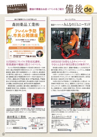 Shop&Service %u5099%u5f8c%u306e%u7d20%u6575%u306a%u304a%u5e97%u30fb%u30a4%u30d9%u30f3%u30c8%u3092%u3054%u7d39%u4ecb %u5099%u5f8cde39%u3000%u30d5%u30ec%u30a4%u30eb%u4e88%u9632%u5e02%u6c11%u516c%u958b%u8b1b%u5ea7%u304c11%u670829%u65e513%u664230%u5206%uff5e15%u664230%u5206%u3001%u798f%u5c71%u5e02%u6771%u685c%u753a%u306e%u770c%u6c11%u6587%u5316%u30bb%u30f3%u30bf%u30fc%u3075%u304f%u3084%u307e%u3067%u958b%u304b%u308c%u308b%u3002%u8b1b%u6f14%u5f8c%u3001%u5065%u5eb7%u306b%u95a2%u3059%u308b%u5404%u7a2e%u6e2c%u5b9a%u30b3%u30fc%u30ca%u30fc%u3092%u8a2d%u3051%u308b%u3002%u53c2%u52a0%u7121%u6599%u3060%u304c%u8981%u4e88%u7d04%u3002%u5b9a%u54e1100%u4eba%u300213%u664230%u5206%uff5e14%u664230%u5206%u306f%u7279%u5225%u8b1b%u6f14%u300c%u8840%u7cd6%u5024%u3068%u7b4b%u529b%u304c%u5065%u5eb7%u9577%u5bff%u306e%u30ab%u30ae%uff01%uff5e%u4eca%u65e5%u304b%u3089%u59cb%u3081%u308b%u30d5%u30ec%u30a4%u30eb%u4e88%u9632%u300d%u3002%u8b1b%u5e2b%u306f%u864e%u306e%u9580%u75c5%u9662%uff08%u6771%u4eac%uff09%u306e%u9580%u8107%u5b5d%u9662%u9577%u3002%u9580%u8107%u9662%u9577%u306f1978%u5e74%u6771%u4eac%u5927%u533b%u5b66%u90e8%u5352%u3001%u540c%u5927%u6559%u6388%u306a%u3069%u3092%u7d4c%u30662020%u5e74%u3088%u308a%u73fe%u8077%u3002%u65e5%u672c%u533b%u5b66%u4f1a%u4f1a%u9577%u3002%u5c02%u9580%u306f%u5185%u79d1%u5b66%u3068%u7cd6%u5c3f%u75c5%u5b66%u3002%u3000%u9aa8%u5f37%u5ea6%u6e2c%u5b9a%u3001%u8840%u6d41%u6e2c%u5b9a%u3001%u63e1%u529b%u6e2c%u5b9a%u3001%u5065%u5eb7%u76f8%u8ac7%u306e%u30b3%u30fc%u30ca%u30fc%u306f%u5148%u7740%u9806%u3067%u53c2%u52a0%u3067%u304d%u308b%u3002%u5e0c%u671b%u8005%u306f%u300111%u670820%u65e5%u307e%u3067%u306bQR%u30b3%u30fc%u30c9%u304b%u540c26%u65e5%u307e%u3067%u306b%u96fb%u8a71%u3067%u7533%u3057%u8fbc%u307f%u3092%u300211%u670829%u65e5%u306b%u30d5%u30ec%u30a4%u30eb%u4e88%u9632%u5e02%u6c11%u8b1b%u5ea7%u3001%u7279%u5225%u8b1b%u6f14%u3084%u5065%u5eb7%u306b%u5f79%u7acb%u3064%u30a4%u30d9%u30f3%u30c8%u3002%u68ee%u7530%u85ac%u54c1%u5de5%u696d%u32311929%u5e74%u306b%u798f%u5c71%u3067%u5275%u696d%u3057%u305f%u68ee%u7530%u85ac%u54c1%u5de5%u696d%u306f%u3001%u533b%u85ac%u54c1%u3084%u533b%u85ac%u90e8%u5916%u54c1%u3001%u6804%u990a%u6a5f%u80fd%u98df%u54c1%u306a%u3069%u3092%u88fd%u9020%u3057%u3066%u3044%u308b%u3002%u30d5%u30ec%u30a4%u30eb%u4e88%u9632%u306b%u5f79%u7acb%u3064%u300c%u30d3%u30bf%u30e2%u6db2%u300d%uff08%u5199%u771f%u53f3%u4e0b%u3001630g%u30013780%u5186%uff09%u306f%u540c%u793e%u30db%u30fc%u30e0%u30da%u30fc%u30b8%u306a%u3069%u3067%u8ca9%u58f2%u4e2d%u3002%u8870%u3048%u4e88%u5099%u8ecd%u306e%u30d5%u30ec%u30a4%u30eb%u3092%u4e88%u9632%u3057%u3088%u3046%u798f%u5c71%u5e02%u5927%u9580%u753a%u91ce%u3005%u6d5c1059%u260e084%u30fb943%u30fb9900%u25c6%u55b6%uff0f8%uff1a30%uff5e17%uff1a00%u25c6%u4f11%uff0f%u571f%u30fb%u65e5%u66dc%u3001%u795d%u65e5%u30db%u30fc%u30e0%u30da%u30fc%u30b8%u68ee%u7530%u85ac%u54c1%u5de5%u696d%u3231%u68ee%u7530%u85ac%u54c1%u5de5%u696d %u691c%u7d22%u798f%u5c71%u99c5 %u3055%u3093%u3059%u3066%u30a2%u30a4%u30cd%u30b9%u30d5%u30af%u30e4%u30de%u770c%u6c11%u6587%u5316%u30bb%u30f3%u30bf%u30fc%u3075%u304f%u3084%u307e%u798f%u5c71%u5e02%u5f79%u6240 %u3082%u307f%u3058%u9280%u884c%u5929%u6e80%u5c4b%u30cb%u30e5%u30fc%u30ad%u30e3%u30c3%u30b9%u30eb%u30db%u30c6%u30eb%u2605%u305d%u306e%u4eba%u306e%u72b6%u614b%u306b%u3075%u3055%u308f%u3057%u3044%u30de%u30b7%u30f3%u306e%u4f7f%u3044%u65b9%u3092%u3001%u3053%u306e%u30de%u30b7%u30f3%u306b%u307b%u308c%u3053%u3093%u3060%u8c37%u6751%u53cb%u98db%u5e97%u9577%uff08%u5199%u771f%u4e0a%uff09%u3089%u30b9%u30bf%u30c3%u30d5%u304c%u4e01%u5be7%u306b%u6307%u5c0e%u3057%u3066%u304f%u308c%u308b%u304b%u3089%u5b89%u5fc3%u3060%u3002%u8c37%u6751%u5e97%u9577%u306f%u300c%u307e%u305a%u306f1%u5ea6%u4f53%u9a13%u3057%u3066%u307f%u3066%u300d%u3068%u547c%u3073%u639b%u3051%u3066%u3044%u308b%u300210%u670831%u65e5%u307e%u3067%u304a%u5f97%u306a%u5165%u4f1a%u30ad%u30e3%u30f3%u30da%u30fc%u30f3%uff01%u4eca%u306a%u3089%u5165%u4f1a%u91d1%u3084%u521d%u6708%u4f1a%u8cbb%u306a%u3069%u304c%u7121%u6599%u3067%u3059%u3002%u30c8%u30ec%u30fc%u30cb%u30f3%u30b0%u30b8%u30e0%u3000%u4f53%u3092%u935b%u3048%u308b%u76ee%u7684%u306b%u52a0%u3048%u3066%u3001%u8170%u75db%u3084%u819d%u75db%u3068%u3044%u3063%u305f%u3055%u307e%u3056%u307e%u306a%u4e0d%u8abf%u306e%u6539%u5584%u306b%u7279%u5316%u3057%u305f%u30de%u30b7%u30f3%u3082%u305d%u308d%u3046%u30c8%u30ec%u30fc%u30cb%u30f3%u30b0%u30b8%u30e0%u3002%u3231%u935b%u932c%uff08%u6ecb%u8cc0%u770c%uff09%u88fd%u306e%u8d64%u3068%u9ed2%u306e%u30de%u30b7%u30f3%u304c50%u53f0%u4e26%u3076%u3002%u300010%u67081%uff5e31%u65e5%u307e%u3067%u5165%u4f1a%u30ad%u30e3%u30f3%u30da%u30fc%u30f3%u3092%u884c%u3046%u3002%u671f%u9593%u4e2d%u306f%u5165%u4f1a%u91d1%uff085500%u5186%uff09%u3084%u30bb%u30ad%u30e5%u30ea%u30c6%u30a3%u30ad%u30fc%u767a%u884c%u8cbb%u7528%uff085500%u5186%uff09%u3001%u521d%u6708%u4f1a%u8cbb%uff083500%uff5e8800%u5186%uff09%u304c%u5168%u3066%u7121%u6599%u3067%u3068%u3063%u3066%u3082%u304a%u5f97%u3002%u300010%u670831%u65e5%u307e%u3067%u306f%u4e88%u7d04%u6642%u306b%u300c%u3053%u306e%u8a18%u4e8b%u3092%u898b%u305f%u300d%u3068%u8a00%u3048%u3070%u30011%u30ab%u6708%u7121%u6599%u3067%u5229%u7528%u3067%u304d%u308b%u3002%u305d%u306e%u4e0a%u3001%u671f%u9593%u4e2d%u306b%u5165%u4f1a%u3059%u308c%u3070%u3001%u5165%u4f1a%u91d1%u3068%u30bb%u30ad%u30e5%u30ea%u30c6%u30a3%u30ad%u30fc%u3082%u7121%u6599%u306b%u306a%u308b%u3002%u521d%u56de%u4f53%u9a13%u306f%u7121%u6599%u3060%u304c%u3001%u4e88%u7d04%u512a%u5148%u3002%u6c34%u66dc%u3092%u9664%u304f9%uff5e18%u6642%u306b%u4f53%u9a13%u3067%u304d%u308b%u3002%u5e73%u65e518%uff5e20%u6642%u306f%u4e8b%u524d%u306b%u4e88%u7d04%u3057%u3066%u304a%u3051%u3070%u898b%u5b66%u3084%u4f53%u9a13%u306e%u5229%u7528%u3082%u53ef%u80fd%u3002%u798f%u5c71%u5e02%u5357%u8535%u738b%u753a5-14-21%u260e084%u30fb983%u30fb1701%u25c6%u55b6%uff0f6%uff1a00%uff5e24%uff1a00%u3000%u3000%u3000%u30b9%u30bf%u30c3%u30d5%u6ede%u5728%u306f9:00%uff5e18:00%u25c6%u4f11%uff0f%u5e74%u4e2d%u7121%u4f11%u3001%u6c34%u66dc%u306f%u30b9%u30bf%u30c3%u30d5%u4e0d%u5728%u25c6P%uff0f%u3042%u308a%u30db%u30fc%u30e0%u30da%u30fc%u30b8%u5065%u5eb7%u3