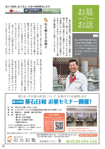 %u5e0c%u671b%u8005%u306fQR%u30b3%u30fc%u30c9%u307e%u305f%u306f%u96fb%u8a71%u3001%u30d5%u30a1%u30af%u30b9%u3001%u30e1%u30fc%u30eb%u3067%u53c2%u52a0%u4eba%u6570%u3001%u4f4f%u6240%u3001%u4ee3%u8868%u8005%u306e%u6c0f%u540d%u3001%u96fb%u8a71%u756a%u53f7%u3001%u500b%u5225%u76f8%u8ac7%u5e0c%u671b%u306e%u6709%u7121%u3092%u660e%u8a18%u3057%u3066%u300c%u77f3%u306e%u5f69%u8056%u300d%u307e%u3067%u7533%u3057%u8fbc%u307f%u3092%u65e5%u3000%u6642%uff0f1%u670831%u65e5%uff08%u571f%u66dc%uff0914%uff1a00%uff5e15%uff1a30%u5834%u3000%u6240%uff0f%u30a8%u30d5%u30d4%u30b3%u30a2%u30ea%u30fc%u30ca%u3075%u304f%u3084%u307e1%u968e%u591a%u76ee%u7684%u5ba4%uff08%u798f%u5c71%u5e02%u5343%u4ee3%u7530%u753a1-1-2%uff09%u5b9a%u3000%u54e1%uff0f%u5148%u774030%u4eba%u3000%u53c2%u52a0%u8cbb%uff0f%u7121%u6599%uff08%u8981%u4e88%u7d04%uff09%u5185%u3000%u5bb9%uff0f%u2022%u5893%u3058%u307e%u3044%u3068%u306f%uff1f%u2022%u5893%u3058%u307e%u3044%u3068%u6c38%u4ee3%u4f9b%u990a%u2022%u5893%u3058%u307e%u3044%u3092%u6c7a%u65ad%u3059%u308b%u524d%u306b%u2022%u304a%u5893%u306e%u7d42%u6d3b%u3068%u306f%u203b%u30bb%u30df%u30ca%u30fc%u5f8c%u3001%u500b%u5225%u76f8%u8ac7%u306b%u3082%u5fdc%u3058%u307e%u3059%uff08%u8981%u4e88%u7d04%uff09%u203b%u4ee5%u524d%u306f%u300c%u30ea%u30d3%u30f3%u30b0%u5893%u77f3%u30bb%u30df%u30ca%u30fc%u300d%u3068%u3057%u3066%u958b%u50ac%u3057%u3066%u3044%u307e%u3057%u305f %u25ce%u53d7%u3051%u4ed8%u3051%u5f8c%u3001%u6848%u5185%u72b6%u3092%u9001%u4ed8%u3057%u307e%u3059%u25ce%u500b%u4eba%u60c5%u5831%u306f%u6848%u5185%u72b6%u306e%u767a%u9001%u306b%u306e%u307f%u4f7f%u7528%u3057%u307e%u3059%u5893%u3058%u307e%u3044%u3084%u304a%u5893%u306e%u7d42%u6d3b%u306b%u3064%u3044%u3066%u3001%u304a%u5893%u306e%u30d7%u30ed%u304c%u8aac%u660e%u3057%u307e%u3059%u66ae%u3089%u3057%u3092%u5f69%u308b%u304a%u5893%u306e%u30a2%u30c9%u30d0%u30a4%u30b6%u30fc%u798f%u5c71%u5e02%u65b0%u6daf%u753a6%u4e01%u76ee15-22 %u3000 fujii@548-saisei.co.jpTEL.084-954-3822%u3000FAX.084-954-3814%u3054 %u304f %u3088%u3046%u306e %u3054 %u3088%u3046 %u306f%u30d5%u30ea%u30fc%u30c0%u30a4%u30e4%u30eb 0120-594-548%u682a%u5f0f%u4f1a%u793e SAISEI %u77f3%u306e%u5f69%u8056 %u304a%u4ecf%u58c7%u30ae%u30e3%u30e9%u30ea%u30fc %u60a0%u3054%u76f8%u8ac7%u306f%u304a%u6c17%u8efd%u306b%u304a%u96fb%u8a71%u4e0b%u3055%u3044%u306f%u308b%u304b%u5f8c%u63f4%uff0f%u3050%u3089%u3093%u3075%u3041%u30fc%u307e%u3008%u7533%u3057%u8fbc%u307f%u8981%u9818%u3009%u958b%u50ac%u6642%u306e%u69d8%u5b50%u7b2c30%u56de %u5893%u77f3%u65e5%u548c %u304a%u5893%u30bb%u30df%u30ca%u30fc%u958b%u50ac%uff0110%u6708%u306b%u306a%u308b%u3068%u3001 %u6691%u3055%u3082%u548c%u3089%u3044%u3067%u904e %u3068%u3046%u300d %u3092%u4f1d%u3048%u308b%u3060%u3051%u3067%u306a%u304f%u3001 %u81ea%u5206 %u306e%u304a%u53c2%u308a%u306f%u3001 %u3054%u5148%u7956%u3055%u307e%u306b %u300c%u3042%u308a%u304c %u3000%u904e%u3054%u3057%u3084%u3059%u3044%u6c17%u5019%u3092%u611f%u3058%u306a%u304c%u3089 %u304b%u3063%u305f%u306e%u3067%u306f%u306a%u3044%u3067%u3057%u3087%u3046%u304b%u3002 %u308a%u304a%u53c2%u308a%u3067%u304d%u306a%u3044%u2026%u300d %u3068%u3044%u3046%u65b9%u3082%u591a %u3044%uff01%uff09 %u3068%u3044%u3046%u611f%u60c5%u304c%u3042%u3063%u3066 %u300c%u3086%u3063%u304f %u308f%u305b%u3066%u3082%u3001 %u6c17%u6301%u3061%u306e%u3069%u3053%u304b%u3067 %uff08%u6691 %u9177%u6691%u3067%u306f%u3001 %u304a%u5893%u53c2%u308a%u306b%u884c%u3063%u3066%u624b%u3092%u5408 %u304c%u591a%u3044%u3082%u306e%u3067%u3059%u3002 %u3067%u3082%u4eca%u5e74%u306e%u3088%u3046%u306a %u3084%u304a%u5f7c%u5cb8%u306a%u3069%u3001 %u590f%u306f%u304a%u53c2%u308a%u3059%u308b%u6a5f%u4f1a %u3054%u3057%u3084%u3059%u3044%u6c17%u5019%u306b%u306a%u308a%u307e%u3059%u306d%u3002 %u304a%u76c6%u81ea%u3059%u3088%u306d%u3002 %u8eab%u3092%u632f%u308a%u8fd4%u308b%u304d%u3063%u304b%u3051%u306b%u3082%u306a%u308a%u307e10%u6708%u306f%u795e%u7121%u6708 %uff08%u304b%u3093%u306a%u3065%u304d%uff09 %u3068%u3044 %u3057%u308c%u307e%u305b%u3093%u306d%u3002 %u308a%u3068%u304a%u53c2%u308a%u3057%u3066%u307f%u308b%u306e%u3082%u3044%u3044%u304b%u3082 %u5fc3%u3092%u843d%u3061%u7740%u304b%u305b%u308b%u6c17%u6301%u3061%u3067%u3001 %u3086%u3063%u305f %u3000%u65b0%u751f%u6d3b%u304b%u3089%u534a%u5e74%u7d4c%u3061%u307e%u3059%u304c%u3001 %u5c11%u3057 %u3044%u308f%u308c%u308b%u305d%u3046%u3067%u3059%u3002 %u3057%u3001 %u5148%u7956%u306b%u624b%u3092%u5408%u308f%u305b%u308b%u5b63%u7bc0%uff09 %u3068%u3082 %u308f%u308c%u308b%u305d%u3046%u3067%u3059%u3002 %u307e%u305f %uff08%u5b9f%u308a%u306b%u611f%u8b1d %u3046%u610f%u5473%u3067%u306f%u306a%u3044%u305d%u3046%u3067%u3001 %u795e%u306e%u6708%u3068%u3044 %u3044%u307e%u3059%u304c%u3001 %u795e%u69d8%u304c%u3044%u306a%u3044 %uff08%u7121%u3044%uff09 %u3068%u3044%u5fc3%u3092%u6574%u3048%u308b%u304a%u53c2%u308a %u5de5%u7a0b%u3092%u66f8%u9762%u306b%u3057%u3066%u304a%u6e21%u3057%u3057%u3066%u304a%u308a%u307e%u3059%u3002 %u3092%u5b89%u5fc3%u3057%u3066%u304a%u4efb%u305b%u3044%u305f%u3060%u3051%u308b%u3088%u3046%u306b%u5de5%u4e8b %u304a%u5ba2%u69d8%u306b%u306f%u4e00%u751f%u306b%u4e00%u5ea6%u306e%u5927%u5207%u306a%u304a%u5893%u4f5c%u308a %u58c7%u3084%u304a%u4f4d%u724c%u3001 %u4ecf%u5177%u306a%u3069%u3082%u5c55%u793a%u3057%u3066%u304a%u308a%u307e%u3059%u3002 %u4e8b%u307e%u3067%u4e00%u8cab%u3057%u3066%u627f%u3063%u3066%u304a%u308a%u307e%u3059%u3002 %u307e%u305f%u304a%u4ecf %u3000%u798f%u5c71%u5e02%u65b0%u6daf%u753a%u3067%u304a%u5893%u306e%u8ca9%u58f2%u3084%u3054%u63d0%u6848%u3001 %u5de5%u8aad%u3093%u3067%u7d0d%u5f97%u3001%u898b%u3066%u5b89%u5fc3%u3002%u304a%u5893%u306e%u7591%u554f%u89e3%u6c7a%u3057%u307e%u3059%uff01%u3231%u77f3%u306e%u5f69%u8056%u306e%u85e4%u4e95%u548c%u5e78%u793e%u9577%u304c%u304a%u5893%u306b%u95a2%u3059%u308b%u77e5%u8b58%u3092%u3001%u6bce%u6708%u30b3%u30e9%u30e0%u3068%u3044%u3046%u5f62%u3067%u304a%u4f1d%u3048%u3057%u307e%u3059%u3002%u30a2%u30ca%u30bf%u3082%u3053%u306e%u8a8c%u9762%u3067%u304a%u5893%u306e%u3053%u3068%u3092%u3057%u3063%u304b%u308a%u5b66%u3093%u3067%u307f%u307e%u305b%u3093%u304b%uff1f%u65e5%u672c%u77f3%u6750%u7523%u696d%u5354%u4f1a %u7d42%u6d3b%u30ab%u30a6%u30f3%u30bb%u30e9%u3