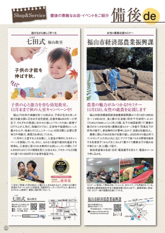 Shop&Service %u5099%u5f8c%u306e%u7d20%u6575%u306a%u304a%u5e97%u30fb%u30a4%u30d9%u30f3%u30c8%u3092%u3054%u7d39%u4ecb %u5099%u5f8cde39%u3000%u798f%u5c71%u5e02%u7d4c%u6e08%u74b0%u5883%u5c40%u7d4c%u6e08%u90e8%u8fb2%u696d%u632f%u8208%u8ab2%u306f11%u670815%u65e513%u664230%u5206%uff5e14%u664240%u5206%u3001%u98df%u3068%u8fb2%u306e%u4ea4%u6d41%u9928%uff08%u540c%u5e02%u5343%u4ee3%u7530%u753a1-2-41%u300cFUKUYAMA%u3075%u304f%u3075%u304f%u5e02%u300d%u306e%u96a3%u3001%u53f3%u4e0b%u306e%u5730%u56f3%u53c2%u7167%uff09%u3067%u300c%u8fb2%u696d%u306e%u9b45%u529b%u304c%u307f%u3064%u304b%u308b!!%u5973%u6027%u00d7%u8fb2%u696d%u5fdc%u63f4%u30bb%u30df%u30ca%u30fc%u300d%u3092%u50ac%u3059%uff08%u5199%u771f%u5de6%u4e0b%u304c%u6628%u5e74%u306e%u69d8%u5b50%uff09%u3002%u53c2%u52a0%u7121%u6599%u3060%u304c%u8981%u7533%u3057%u8fbc%u307f%u3067%u3001%u5b9a%u54e1%u306f%u5148%u774020%u4eba%u3002%u3000%u8fb2%u696d%u306b%u95a2%u5fc3%u306e%u3042%u308b%u5973%u6027%u304c%u5bfe%u8c61%u306e%u50ac%u3057%u30022025%u5e74%u304b%u3089%u798f%u5c71%u5e02%u3067%u3001%u30a4%u30f3%u30c9%u30cd%u30b7%u30a2%u4eba%u306e%u592b%u3068%u3068%u3082%u306b%u4e3b%u306b%u30a2%u30b8%u30a2%u3067%u98df%u3079%u3089%u308c%u308b%u91ce%u83dc%u3092%u683d%u57f9%u3059%u308b%u5148%u5bb6%u8309%u5b50%uff08%u305b%u3093%u3052%u307e%u3053%uff09%u3055%u3093%u304c%u300c%u8fb2%u30e9%u30a4%u30d5%uff01%u8fb2%u696d%u5973%u5b50%u304c%u8e0f%u307f%u51fa%u3059%u65b0%u305f%u306a%u4e00%u6b69%u300d%u3068%u984c%u3057%u3066%u8a71%u3059%u3002%u3000%u53c2%u52a0%u5e0c%u671b%u8005%u306f%u540d%u524d%u30fb%u4f4f%u6240%u30fb%u96fb%u8a71%u756a%u53f7%u3092%u6dfb%u3048%u3066%u3001%u96fb%u8a71%u304b%u30e1%u30fc%u30eb%u3067%u7533%u3057%u8fbc%u307f%u3092%u3002%u8fb2%u696d%u306e%u9b45%u529b%u304c%u307f%u3064%u304b%u308b%uff01%uff01%u30bb%u30df%u30ca%u30fc11%u670815%u65e5%u3001%u5973%u6027%u306e%u5c31%u8fb2%u3092%u5fdc%u63f4%u3057%u307e%u3059%u798f%u5c71%u5e02%u6771%u685c%u753a3-5%u260e084%u30fb928%u30fb1177%u3000%uff08%u5e73%u65e58%u664230%u5206%uff5e17%u664215%u5206%uff09 nougyou-shinkou@city. fukuyama.hiroshima.jp%u30bb%u30df%u30ca%u30fc%u306b%u53c2%u52a0%u3057%u3066%u8208%u5473%u3092%u62b1%u3044%u305f%u4eba%u306b%u306f%u3001%u6b21%u306e%u30b9%u30c6%u30c3%u30d7%u3082%u7528%u610f%u3055%u308c%u3066%u3044%u308b%u3002%u5e0c%u671b%u8005%u306f%u8fb2%u696d%u73fe%u5834%u898b%u5b66%u4f1a%u3084%u8fb2%u696d%u4f53%u9a13%uff08%u540c%u5927%u3068%u53f3%u4e0b%uff09%u3001%u8fb2%u696d%u7814%u4fee%u306b%u53c2%u52a0%u3067%u304d%u3001%u30bb%u30df%u30ca%u30fc%u5f8c%u306e%u5c31%u8fb2%u3092%u5fdc%u63f4%u3057%u3066%u304f%u308c%u308b%u3002%u5973%u6027%u00d7%u8fb2%u696d%u5fdc%u63f4%u30bb%u30df%u30ca%u30fc%u798f%u5c71%u5e02%u7d4c%u6e08%u90e8%u8fb2%u696d%u632f%u8208%u8ab2%u798f%u5c71%u5e02%u7d4c%u6e08%u90e8%u8fb2%u696d%u632f%u8208%u8ab2%u30ab%u30e9%u30aa%u30b1%u30cf%u30cb%u30fc%u30d3%u30fc%u30e6%u30fc%u30db%u30fc %u6c34%u5451%u5927%u6a4b%u798f%u5c71%u99c5%u4e2d%u56fd%u9280%u884c %u5e83%u5cf6%u9280%u884c%u82a6%u7530%u5ddd%u306f%u308b%u3084%u307e72 %u26052%u30e1%u30fc%u30ebQR%u30b3%u30fc%u30c9%u3000%u798f%u5c71%u306735%u5e74%u306e%u5b9f%u7e3e%u3092%u6301%u3064%u4e03%u7530%u5f0f%u306f%u3001%u5b50%u4f9b%u304c%u751f%u307e%u308c%u6301%u3063%u305f%u80fd%u529b%u3092%u6700%u5927%u9650%u306b%u5f15%u304d%u51fa%u3059%u5e7c%u5150%u6559%u5ba4%u3002%u5bfe%u8c61%u5e74%u9f62%u306f%uff16%u30ab%u6708%uff5e%u5c0f%u5b66%u751f%u3067%u3001%u305d%u308c%u305e%u308c%u306e%u767a%u9054%u306b%u5408%u308f%u305b%u305f%u697d%u3057%u304f%u30d0%u30e9%u30f3%u30b9%u306e%u826f%u3044%u6559%u80b2%u30d7%u30ed%u30b0%u30e9%u30e0%u304c%u4eba%u6c17%u3060%u3002%u77e5%u8b58%u3060%u3051%u3067%u306a%u304f%u3001%u4e3b%u4f53%u6027%u3084%u5354%u8abf%u6027%u3068%u3044%u3063%u305f%u8c4a%u304b%u306a%u5fc3%u3084%u3001%u4ed6%u8005%u3068%u306e%u30b3%u30df%u30e5%u30cb%u30b1%u30fc%u30b7%u30e7%u30f3%u3092%u56f3%u308b%u969b%u306b%u5fc5%u8981%u306a%u601d%u8003%u529b%u3084%u5224%u65ad%u529b%u3001%u8868%u73fe%u529b%u3082%u4f38%u3070%u3057%u3066%u304f%u308c%u308b%u3002%u300011%u6708%u4e2d%u306b%u5165%u5ba4%u3059%u308b%u4eba%u3092%u5bfe%u8c61%u306b%u3001%u5165%u5ba4%u91d1%u304c%u7121%u6599%u306b%u306a%u308b%u30ad%u30e3%u30f3%u30da%u30fc%u30f3%u3092%u5b9f%u65bd%u3057%u3066%u3044%u308b%u3002%u3055%u3089%u306b%u3001%u3082%u308c%u306a%u304f%u5e0c%u671b%u306e%u6559%u6750%u3092%u9032%u5448%u3059%u308b%u7279%u5178%u3082%u3002%u5165%u5ba4%u524d%u306b%u53d7%u3051%u3089%u308c%u308b%u7121%u6599%u306e%u304a%u8a66%u3057%u30ec%u30c3%u30b9%u30f3%u306e%u969b%u306b%u300c%u3073%u3093%u307e%u308b%u307e%u305f%u306f%u30d3%u30b8%u30cd%u30b9%u60c5%u5831%u3092%u898b%u305f%u300d%u3068%u4f1d%u3048%u308b%u3068%u3001%u30af%u30aa%u30ab%u30fc%u30c9%u306a%u3069%uff13%u7a2e%u304b%u3089%u9078%u3079%u308b1000%u5186%u5206%u306e%u91d1%u5238%u3092%u9032%u5448%u3059%u308b%u3002%u5b50%u4f9b%u306e%u5fc3%u3068%u80fd%u529b%u3092%u80b2%u3080%u5e7c%u5150%u6559%u5ba4%u300211%u6708%u672b%u307e%u3067%u79cb%u306e%u5165%u5ba4%u30ad%u30e3%u30f3%u30da%u30fc%u30f3%u4e2d%uff01%u798f%u5c71%u5e02%u4e09%u4e4b%u4e38%u753a4-28%u260e084%u30fb921%u30fb2121%u25c6%u55b6%uff0f9:30%uff5e18:30%u25c6%u4f11%uff0f%u65e5%u30fb%u6708%u66dc%u3001%u795d%u65e5%u30db%u30fc%u30e0%u30da%u30fc%u30b8%u4e03%u7530%u5f0f %u798f%u5c71%u6559%u5ba4%u4e03%u7530%u5f0f %u798f%u5c71%u6559%u5ba4%u300c%u300e%u597d%u304d%u300f%u300e%u5f97%u610f%u300f%u306e%u82bd%u3092%u4f38%u3070%u3057%u3066%u8c4a%u304b%u306a%u4eba%u751f%u3092%u9001%u308c%u308b%u3088%u3046%u3001%u5b50%u4f9b%u305f%u3061%u306e%u5922%u306e%u5b9f%u73fe%u3092%u30b5%u30dd%u30fc%u30c8%u3057%u307e%u3059%u300d%u3068%u540c%u6559%u5ba4%u3002%u6708%u9f62%u5225%u306e%u30ec%u30c3%u30b9%u30f3%u30d7%u30ed%u30b0%u30e9%u30e0%u3068%u3001%u6700%u59276%u4eba%u307e%u3067%u306e%u5c11%u4eba%u6570%u5236%u3067%u3001%u7740%u5b9f%u306b%u8133%u3092%u80b2%u3066%u308b%u3068%u3044%u3046%u3002%u904a%u3073%u306a%u304c%u3089%u697d%u3057%u304f%u5b66%u3079%u308b%u4e03%u7530%u5f0f %u798f%u5c71 %u691c%u7d22%uff3bHP%uff3d %uff3bInstagram%uff3d%u3057%u3061%u3060%u3057%u3061%u3060%u798f%u5c71%u99c5 %u3055%u3093%u3059%u3066%u30a2%u30a4%u30cd%u30b9%u30d5%