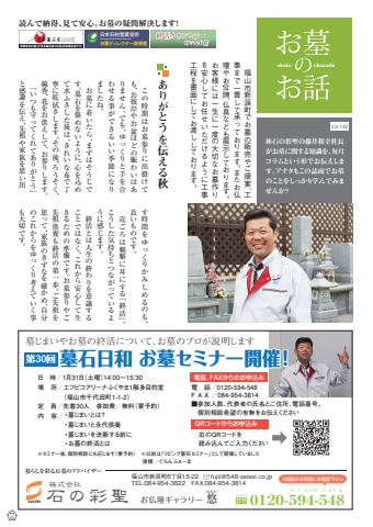 %u65e5%u3000%u6642%uff0f1%u670831%u65e5%uff08%u571f%u66dc%uff0914%uff1a00%uff5e15%uff1a30%u5834%u3000%u6240%uff0f%u30a8%u30d5%u30d4%u30b3%u30a2%u30ea%u30fc%u30ca%u3075%u304f%u3084%u307e1%u968e%u591a%u76ee%u7684%u5ba4%u3000%u3000%u3000%u3000%uff08%u798f%u5c71%u5e02%u5343%u4ee3%u7530%u753a1-1-2%uff09%u5b9a%u3000%u54e1%uff0f%u5148%u774030%u4eba%u3000%u53c2%u52a0%u8cbb%uff0f%u7121%u6599%uff08%u8981%u4e88%u7d04%uff09%u5185%u3000%u5bb9%uff0f%u96fb%u3000%u8a71%uff0f0120-594-548FAX %uff0f084-954-3814%u25a0%u53c2%u52a0%u4eba%u6570%u3001%u4ee3%u8868%u8005%u306e%u6c0f%u540d%u3068%u3054%u4f4f%u6240%u3001%u96fb%u8a71%u756a%u53f7%u3001%u3000%u500b%u5225%u76f8%u8ac7%u5e0c%u671b%u306e%u6709%u7121%u3092%u304a%u4f1d%u3048%u304f%u3060%u3055%u3044%u53f3%u306eQR%u30b3%u30fc%u30c9%u3092%u8aad%u307f%u8fbc%u3093%u3067%u3054%u5165%u529b%u304f%u3060%u3055%u3044%u2022%u5893%u3058%u307e%u3044%u3068%u306f%uff1f%u2022%u5893%u3058%u307e%u3044%u3068%u6c38%u4ee3%u4f9b%u990a%u2022%u5893%u3058%u307e%u3044%u3092%u6c7a%u65ad%u3059%u308b%u524d%u306b%u2022%u304a%u5893%u306e%u7d42%u6d3b%u3068%u306f%u203b%u30bb%u30df%u30ca%u30fc%u5f8c%u3001%u500b%u5225%u76f8%u8ac7%u306b%u3082%u5fdc%u3058%u307e%u3059%uff08%u8981%u4e88%u7d04%uff09%u3000%u203b%u4ee5%u524d%u306f%u300c%u30ea%u30d3%u30f3%u30b0%u5893%u77f3%u30bb%u30df%u30ca%u30fc%u300d%u3068%u3057%u3066%u958b%u50ac%u3057%u3066%u3044%u307e%u3057%u305f%u5893%u3058%u307e%u3044%u3084%u304a%u5893%u306e%u7d42%u6d3b%u306b%u3064%u3044%u3066%u3001%u304a%u5893%u306e%u30d7%u30ed%u304c%u8aac%u660e%u3057%u307e%u3059%u66ae%u3089%u3057%u3092%u5f69%u308b%u304a%u5893%u306e%u30a2%u30c9%u30d0%u30a4%u30b6%u30fc%u798f%u5c71%u5e02%u65b0%u6daf%u753a6%u4e01%u76ee15-22 %u3000 fujii@548-saisei.co.jpTEL.084-954-3822%u3000FAX.084-954-3814%u3054 %u304f %u3088%u3046%u306e %u3054 %u3088%u3046 %u306f%u30d5%u30ea%u30fc%u30c0%u30a4%u30e4%u30eb 0120-594-548%u682a%u5f0f%u4f1a%u793e SAISEI %u77f3%u306e%u5f69%u8056 %u304a%u4ecf%u58c7%u30ae%u30e3%u30e9%u30ea%u30fc %u60a0%u3054%u76f8%u8ac7%u306f%u304a%u6c17%u8efd%u306b%u304a%u96fb%u8a71%u4e0b%u3055%u3044%u306f%u308b%u304b%u5f8c%u63f4%uff0f%u3050%u3089%u3093%u3075%u3041%u30fc%u307e%u7b2c30%u56de %u5893%u77f3%u65e5%u548c %u304a%u5893%u30bb%u30df%u30ca%u30fc%u958b%u50ac%uff01%u3053%u306e%u6642%u671f%u306f%u304a%u5893%u53c2%u308a%u306b%u51fa%u639b%u3051%u3066 %u3068%u611f%u8b1d%u3092%u4f1d%u3048%u3001 %u5148%u7956%u3084%u5bb6%u65cf%u3092%u601d%u3044%u51fa %u3000 %u300c%u3044%u3064%u3082%u5b88%u3063%u3066%u304f%u308c%u3066%u3042%u308a%u304c%u3068%u3046%u300d %u7dda%u9999%u3001 %u82b1%u3092%u304a%u4f9b%u3048%u3057%u3066%u3001 %u304a%u53c2%u308a%u3057%u307e%u3059%u3002 %u5be7%u306b%u4e7e%u62ed%u304d%u3057%u307e%u3059%u3002 %u305d%u306e%u5f8c%u3001 %u308d%u3046%u305d%u304f%u3001 %u3066%u6c34%u3075%u304d%u3057%u305f%u5f8c%u306f%u3001 %u304d%u308c%u3044%u306a%u5e03%u3067%u4e01 %u3059%u3002 %u5893%u77f3%u3092%u50b7%u3081%u306a%u3044%u3088%u3046%u306b%u3001 %u5fc3%u3092%u8fbc%u3081 %u3000%u304a%u5893%u306b%u7740%u3044%u305f%u3089%u3001 %u307e%u305a%u306f%u305d%u3046%u3058%u3067 %u307e%u3057%u305f%u306d%u3002 %u308f%u305b%u308b%u4e8b%u304c%u3067%u304d%u308b%u3044%u3044%u5b63%u7bc0%u306b%u306a%u308a %u308a%u307e%u305b%u3093%u3002 %u3067%u3082%u3001 %u3086%u3063%u304f%u308a%u3068%u624b%u3092%u5408 %u3082%u3001 %u304a%u5f7c%u5cb8%u3084%u304a%u76c6%u307b%u3069%u306e%u8cd1%u308f%u3044%u306f%u3042%u3082%u5927%u5207%u3067%u3059%u3002 %u306e%u3053%u308c%u304b%u3089%u3092%u3086%u3063%u304f%u308a%u8003%u3048%u3066%u3044%u304f%u4e8b %u601d%u3063%u3066%u3001 %u5bb6%u65cf%u306e%u304d%u305a%u306a%u3092%u78ba%u304b%u3081%u3001 %u81ea%u5206 %u5148%u7956%u4f9b%u990a%u3082%u7d42%u6d3b%u306e%u7b2c%u4e00%u6b69%u3002 %u3054%u5148%u7956%u3092 %u304d%u308b%u305f%u3081%u306e%u6e96%u5099%u3067%u3059%u3002 %u304a%u5893%u53c2%u308a%u3084%u3054 %u3053%u3068%u3067%u306f%u306a%u304f%u3001 %u3053%u308c%u304b%u3089%u5b89%u5fc3%u3057%u3066%u751f %u3000%u7d42%u6d3b%u3068%u306f%u4eba%u751f%u306e%u7d42%u308f%u308a%u3092%u610f%u8b58%u3059%u308b %u3046%u306b%u611f%u3058%u307e%u3059%u3002 %u3053%u3046%u3057%u305f%u6c17%u6301%u3061%u3068%u3064%u306a%u304c%u3063%u3066%u3044%u308b%u3088 %u3000%u8fd1%u3054%u308d%u306f%u983b%u7e41%u306b%u8033%u306b%u3059%u308b %u300c%u7d42%u6d3b%u300d %u3002 %u826f%u3044%u3082%u306e%u3067%u3059%u3002 %u3059%u6642%u9593%u3092%u3086%u3063%u304f%u308a%u304b%u307f%u3057%u3081%u308b%u306e%u3082%u3001%u3042%u308a%u304c%u3068%u3046%u3092%u4f1d%u3048%u308b%u79cb %u5de5%u7a0b%u3092%u66f8%u9762%u306b%u3057%u3066%u304a%u6e21%u3057%u3057%u3066%u304a%u308a%u307e%u3059%u3002 %u3092%u5b89%u5fc3%u3057%u3066%u304a%u4efb%u305b%u3044%u305f%u3060%u3051%u308b%u3088%u3046%u306b%u5de5%u4e8b %u304a%u5ba2%u69d8%u306b%u306f%u4e00%u751f%u306b%u4e00%u5ea6%u306e%u5927%u5207%u306a%u304a%u5893%u4f5c%u308a %u58c7%u3084%u304a%u4f4d%u724c%u3001 %u4ecf%u5177%u306a%u3069%u3082%u5c55%u793a%u3057%u3066%u304a%u308a%u307e%u3059%u3002 %u4e8b%u307e%u3067%u4e00%u8cab%u3057%u3066%u627f%u3063%u3066%u304a%u308a%u307e%u3059%u3002 %u307e%u305f%u304a%u4ecf %u3000%u798f%u5c71%u5e02%u65b0%u6daf%u753a%u3067%u304a%u5893%u306e%u8ca9%u58f2%u3084%u3054%u63d0%u6848%u3001 %u5de5%u8aad%u3093%u3067%u7d0d%u5f97%u3001%u898b%u3066%u5b89%u5fc3%u3002%u304a%u5893%u306e%u7591%u554f%u89e3%u6c7a%u3057%u307e%u3059%uff01%u3231%u77f3%u306e%u5f69%u8056%u306e%u85e4%u4e95%u548c%u5e78%u793e%u9577%u304c%u304a%u5893%u306b%u95a2%u3059%u308b%u77e5%u8b58%u3092%u3001%u6bce%u6708%u30b3%u30e9%u30e0%u3068%u3044%u3046%u5f62%u3067%u304a%u4f1d%u3048%u3057%u307e%u3059%u3002%u30a2%u30ca%u30bf%u3082%u3053%u306e%u8a8c%u9762%u3067%u304a%u5893%u306e%u3053%u3068%u3092%u3057%u3063%u304b%u308a%u5b66%u3093%u3067%u307f%u307e%u305b%u3093%u304b%uff1f%u65e5%u672c%u77f3%u6750%u7523%u696d%u5354%u4f1a %u7d42%u6d3b%u30ab%u30a6%u30f3%u30bb%u30e9%u30fc%u306e%u3044%u308b%u304a%u5e97The Japan Stone Industry Association%u304a%u5893%u30c7%u30a3%u30ec%u30af%u30bf%u30fc%u8cc7%u683c%u8005ohaka ohanashiVol.14253%u96fb%u8a71%u3001FAX%u304b%u3089%u306e%u304a%u7533%u8fbc%u307fQR%u30b3%u30fc%u30c9%u304b%u3089%u304