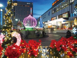 「光でつなぐ、桃太郎のまち」をテーマに、JR岡山駅前広場を中心にLEDのイルミネーションで装飾され、夜の街を華やかに彩ります。