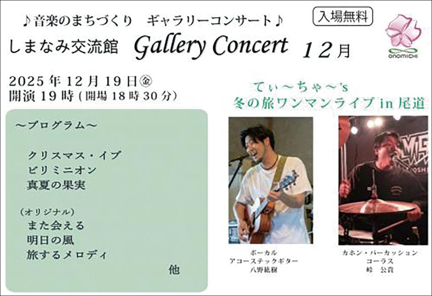 ギャラリーコンサート「てぃ〜ちゃ〜’s ワンマンライブ」が12月19日19─20時、しまなみ交流館(尾道市東御所町)市民ギャラリーで開かれる。入場無料で、事前申し込み不要。