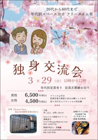 ドリンク付きで参加費は男性6500円、女性4500円。3月27日以降のキャンセルは全額負担になる。希望者は住所・名前・年齢・連絡先を明記して、ラインかメールで申し込みを。ボールペンを持参すること。「独身者同士、複数の人と連絡先を交換して楽しく交流しませんか」と湯藤真弓代表。「参加された方からは『マッチング結果の発表がないから、楽な気持ちで出会いを楽しめた』と好評です」と話す。