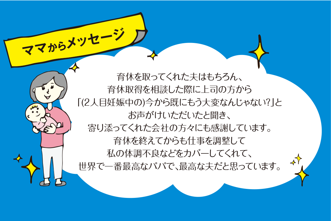 長男の時はコロナ禍で、退院まで直接会うことができませんでしたが、次男の時は産後すぐ触れ合うことができ、うれしかったし、感動しました。また1歳から保育園に通っている長男とゆっくり時間をかけて過ごせたことも良かったです。お盆に長男と2人で実家にドライブしたのは新鮮で楽しかったです。
