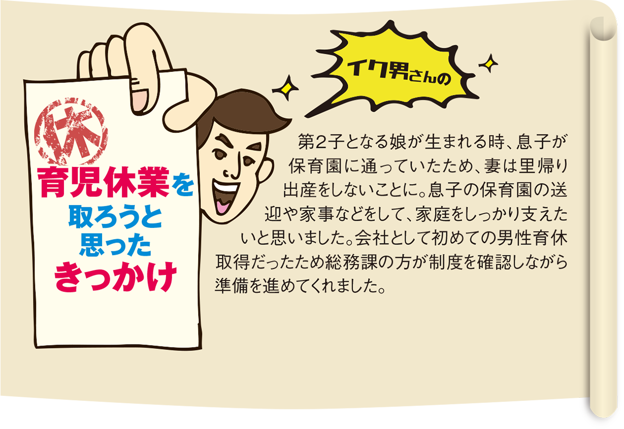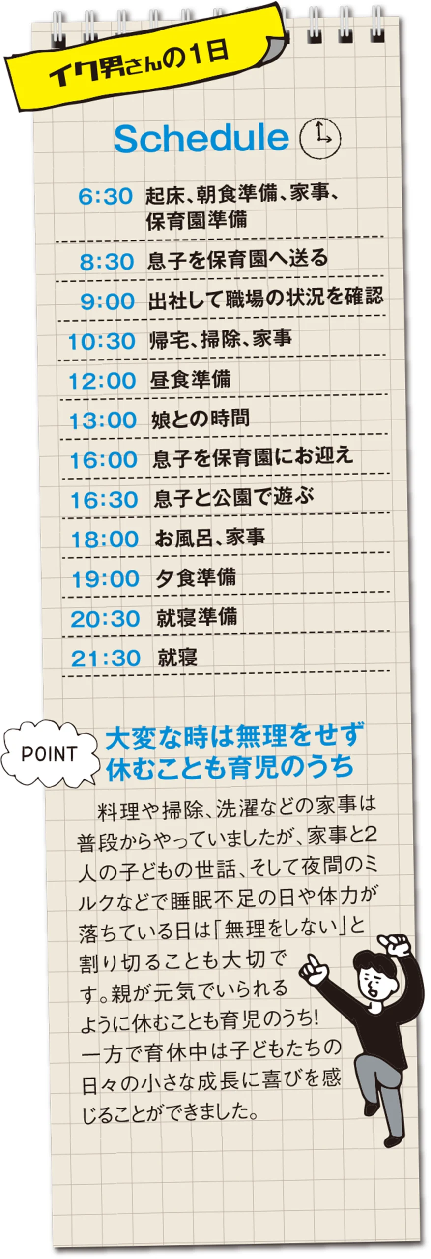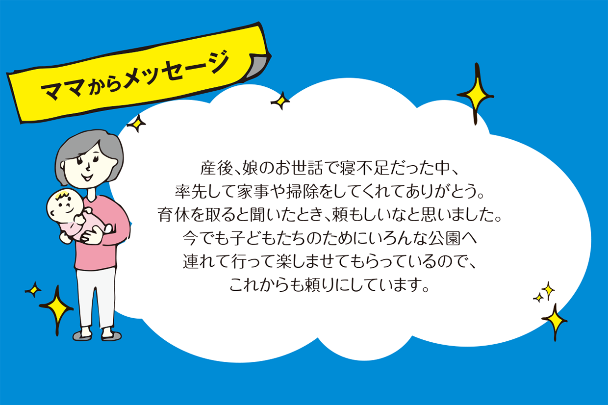 息子と向き合う時間がしっかり取れたことがよかったです。産後妻と娘が入院している間は息子と二人暮らし。保育園の送迎の時間や公園、お風呂など、「パパと一緒」という時間をとても喜んでくれました。一緒に料理をしたり、掃除機を掛けたりして、心の距離がぐっと近づいたと思います。