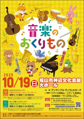 福山市神辺文化会館(同市神辺町川北1155-1)で10月19日、子供と一緒に楽しめるコンサート「音楽のおくりもの」が開催される。対象年齢によって内容と開演時間が異なり、「0歳からのわいわいコンサート」は11時から、「4歳からのアフタヌーン・コンサート」は14時から開く。