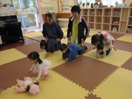 ・内容:支援センターやこども園の保育教諭と一緒にわらべうたを通して親子でふれ合ったり,簡単な手作りおもちゃを作ったりします。わらべうたは人と人とのかかわりを育てます。あなたの声で子どもたちにあたたかい心を伝えましょう。きっと子どもはいい顔になるでしょう。