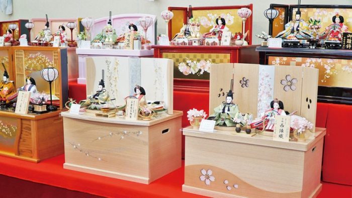 「今年のトレンドはナチュラルカラー」と堀史郎専務。「洋風のインテリアにもマッチする自然な色みが人気です」と話す。コンパクトで飾るのもしまうのも簡単な引き出し式の収納飾り、ガラスケースに入った物など、豊富に展示する=写真下。「飾りたいけど飾るスペースがない」という人も、ぴったりの品が見つかるはず。