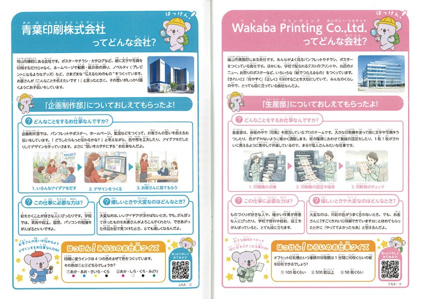 小学生の子供を持つ同チームの浅井優さん=同左=は「児童が地元の企業を身近に感じれば、福山で働くというイメージを描きやすくなります」と話す。