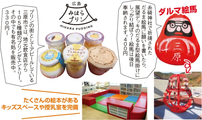 国道2号三原バイパスの是国ランプからすぐ、瀬戸内の浮島を見渡す高台に位置しています。県内随一の水揚げを誇るタコや、ブランド鷄のみはら神明鷄、柑橘類など、地元の幸が揃います。それらを活かして調理するレストランや、八天堂のくりーむパンも人気。また名物のだるまにちなんだ加工品やグッズ、オブジェまで、いろいろな姿のだるまに出会えます。キッズスペースや授乳室も完備され、ママが利用しやすい施設です。屋台や似顔絵コーナーの出店もあり、県内外から幅広い世代が訪れています。