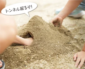 道具は無くとも楽しむ術を直ぐに見つけられる子ども達の才能ですね!とても広い砂場なので、大作の砂のトンネルや素敵なお城も作れますよ。