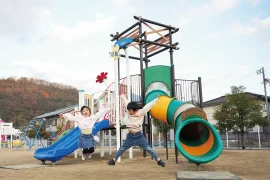 コメダ珈琲店福山新涯店を北へ入ってすぐの公園。まこと保育園の南隣りです。複合型遊具のほか、ブランコやジャングルジム、鉄棒があります。入って一番に目につくのは、周りが砂場で囲まれた、かじったドーナツのような形の遊具。すべり台が2種類と、ウォールクライミングのほかに、トンネルが2本ついています。二人は特にトンネルがお気に入りで、かくれんぼをしたり、トンネルの中でコソコソ話をして秘密基地のように楽しんでいました。
