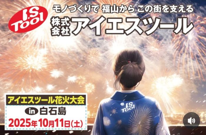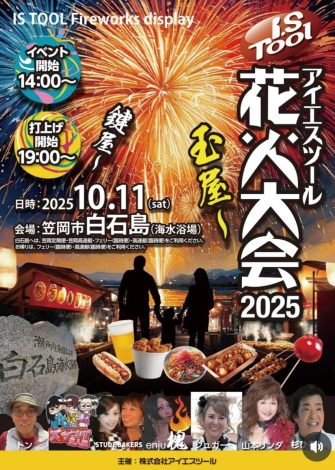 切削工具再研磨・製造の㈱アイエスツール(福山市御幸町1698-1、石原雅也社長)は10月11日14〜20時、笠岡諸島・白石島の海水浴場周辺で「アイエスツール花火大会in白石島」を催す(写真上)。2021年にスタートし、今年で5回目。19時からの花火は数・内容とも年々グレードアップしている。