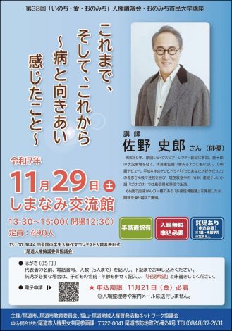 尾道市と同市教育委員会、福山・尾道地域人権啓発活動ネットワーク協議会は11月29日13時30分─15時、第38回「いのち・愛・おのみち」人権講演会・おのみち市民大学講座をしまなみ交流館(尾道市東御所町10-1)で開く。