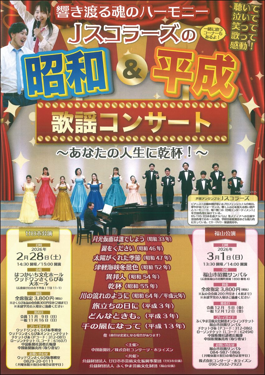 福山市沼隈サンパル(同市沼隈町草深1890-4)で3月1日14時から、「Jスコラーズの昭和&平成 歌謡コンサート〜あなたの人生に乾杯!〜」が開かれる。