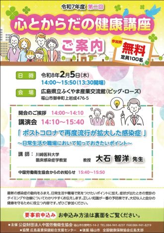 公益財団法人中国労働衛生協会(福山市引野町5-14-2、高尾俊弘理事長)は2月5日14時─15時50分、ビッグ・ローズ(同市御幸町上岩成476-5)で「心とからだの健康講座」を開く。受講無料で、誰でも参加できる。