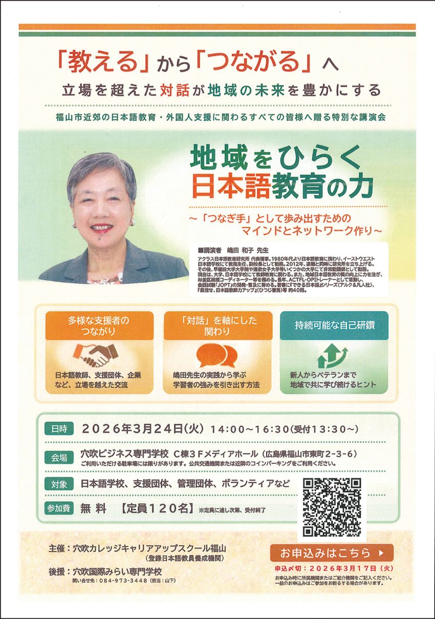 3月24日、穴吹ビジネス専門学校で 講演「地域をひらく日本語教育の力」 日本語教師や外国人支援団体向けに