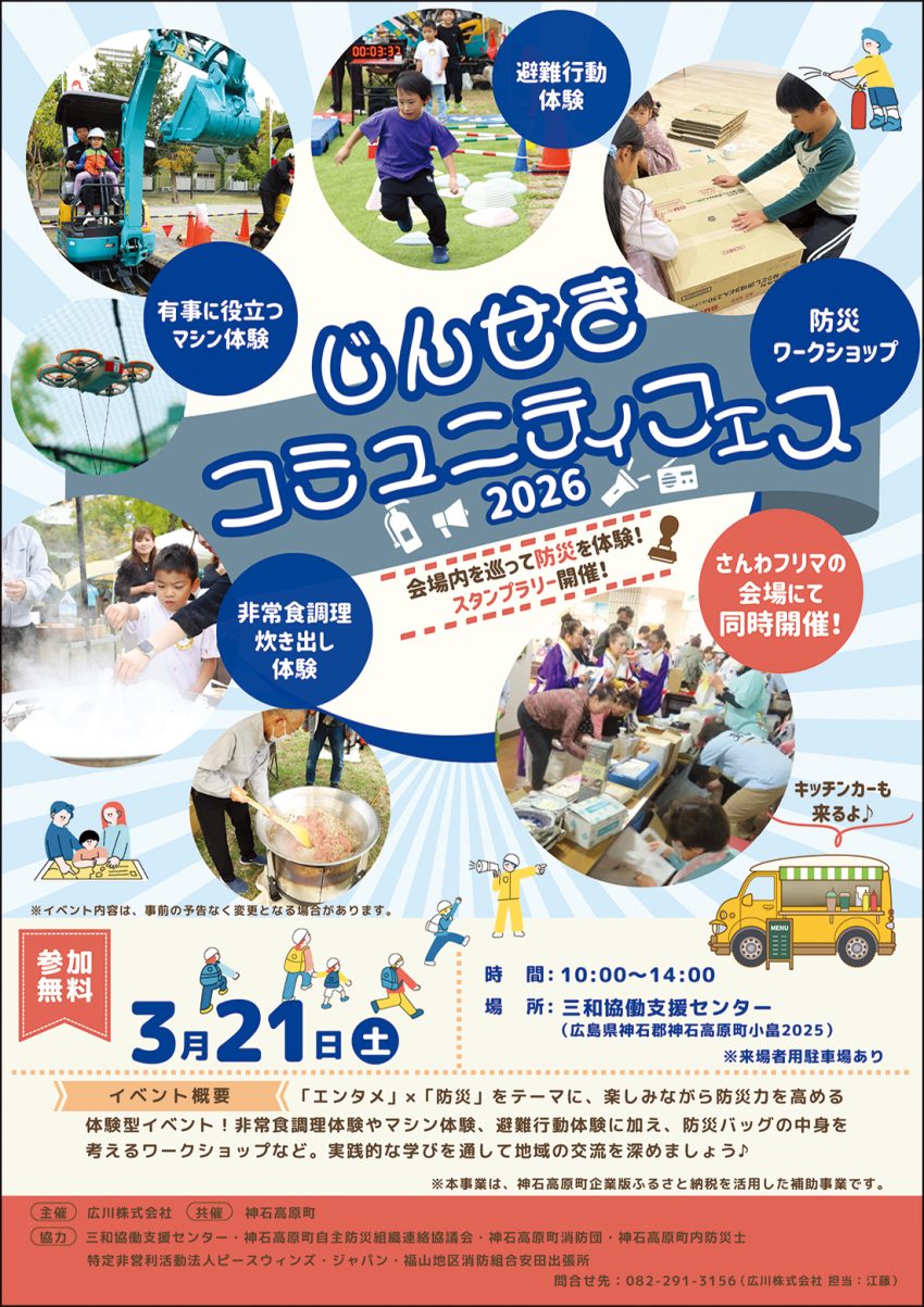 食品・石油エネルギー事業を手掛ける広川㈱(広島市)と神石高原町は3月21日10─14時、三和協働支援センター(同町小畠2025)で防災イベント「じんせきコミュニティフェス2026」を開く。入場無料。