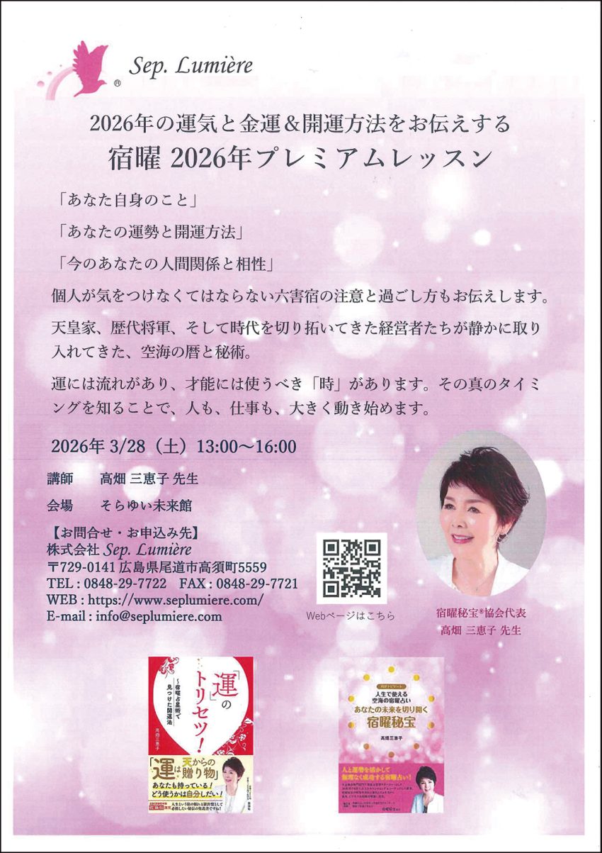 ㈱セプルミエール(山田美妙社長)は3月28日13─16時、同社運営の交流拠点「そらゆい未来館」(尾道市高須町5559)で「宿曜(すくよう)占星術プレミアムレッスン」を催す。定員15人で要予約。