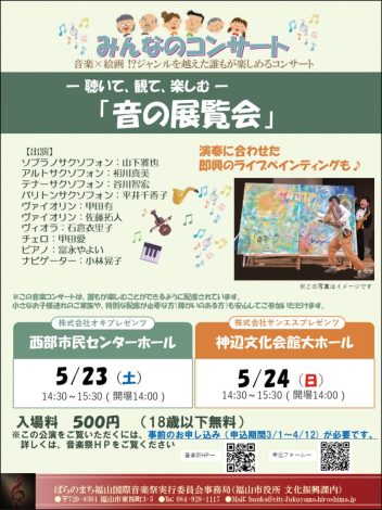 みんなのコンサートは、「音の展覧会」=写真下=をテーマにした生演奏とライブペインティング。23日は西部市民センター(松永町3-1-29)、24日は神辺文化会館(神辺町川北1155-1)で実施する。時間はいずれも14時30分─15時30分。