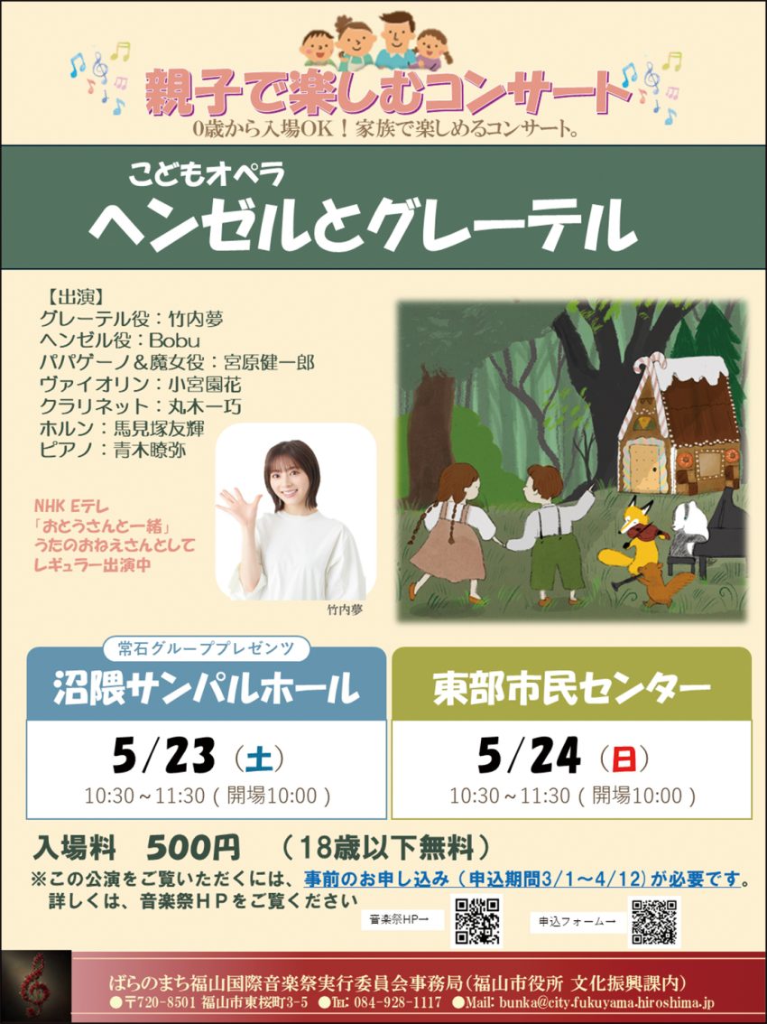 親子で楽しむコンサートは、「こどもオペラ『ヘンゼルとグレーテル』」=写真上=を上演。NHK Eテレの番組「おとうさんといっしょ」の「うたのおねえさん」こと竹内夢さん=写真中=が出演する。会場は23日が沼隈サンパルホール、24日が東部市民センター(伊勢丘6-6-1)で、時間はいずれも10時30分─11時30分。